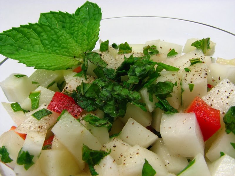 A mentás karalábé receptje nagyon egyszerű, a zöldségeket apró kockákra vágjuk, és hozzákeverjük a minél kisebbre vágott menta leveleket. Megsózzuk, kicsit megborsozzuk, és meglocsoljuk a citromlével és az olajjal.