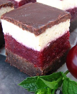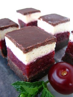 Ez a meggyes kocka azért praktikus, mert az apró falatkákból tényleg elég egy-kettő. Nem lett túl édes, de a dió az alapban elég tömény. Szerintem ez jó lesz más gyümölcsből is, talán barack, szilva, szőlő. Most ez meggyes, amíg van meggy, addig meggyből…