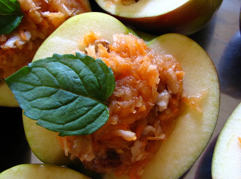 Az almát és a répát lereszeltem, majd citromlével, mazsolával és feldarabolt dióval összekeverem, majd a félbevágott almákat megtöltöm vele. Friss mentalevelekkel lehet díszíteni.