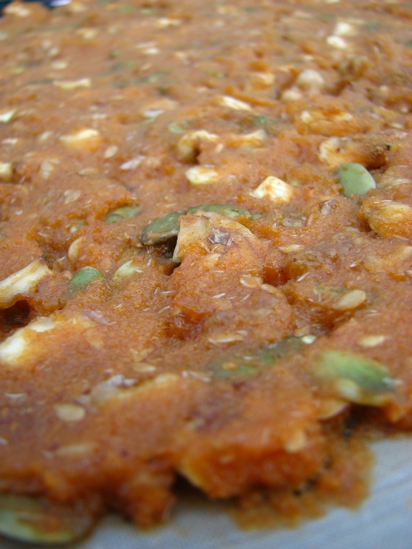 Itt a képen az aszalógépben kiterített massza látszik. Zöld a tökmagtól…