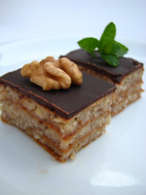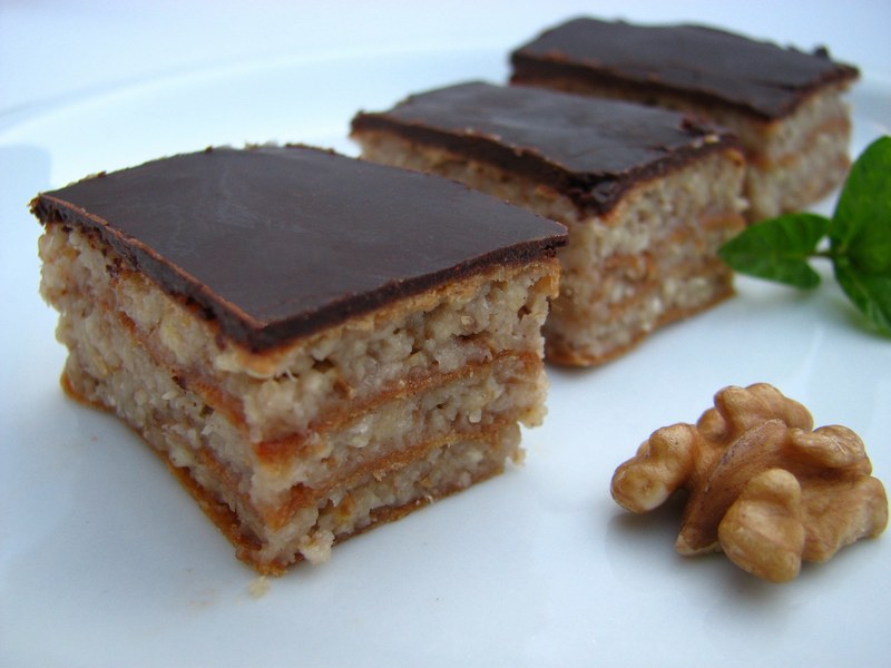 Emlékszem, amikor elhatároztam, hogy áttérek a nyers étkezésre, a legjobban az fájt, hogy a megszokott édességeket nem ehetem többet… de amikor rájöttem, hogy csokit is lehet nyersen készíteni, és ha nem is minden nap, de része lehet a nyers csokoládé az étkezésemnek, akkor bizony volt egyfajta “hurrá” érzésem: megmenekültem! És magában ritkán eszem nyers csokit, de egy ilyen zserbó tetején fantasztikusan finom tud lenni! Ropog, és olvad a szádban, és ott a dió és a gyümölcslap… hát… ilyenkor érzem, hogy micsoda gasztronómia van itt is “nyershonban”.