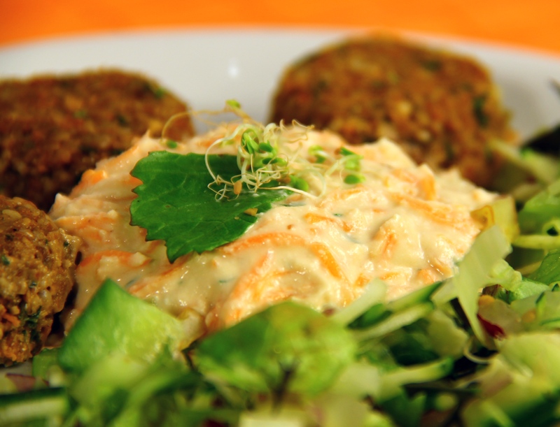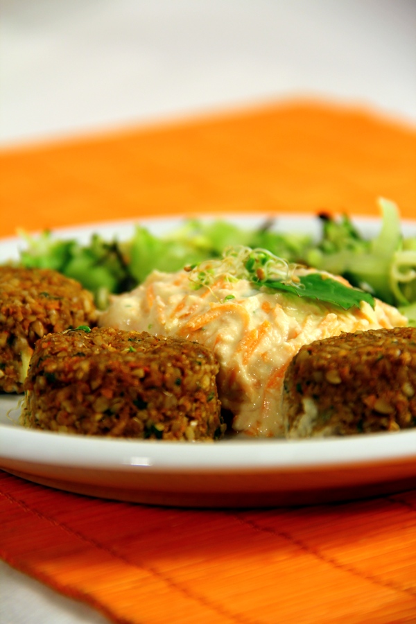 A mandulát kevés vízzel simára turmixoljuk, hogy egy tejfölszerű, krémes mártást kapjunk. Ízlés szerint ízesítjük sóval, borssal, citromlével. Összekeverjük a lereszelt sárgarépával és az apróra vágott petrezselyemmel.