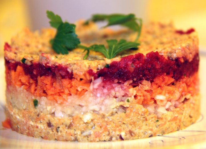 Ezután jön a következő réteg, pl. a céklás, ebből is kb 1 ujjnyit teszünk a karikába. A következő réteg a világos káposztás, majd a sárgarépás jön. Ezt szépen lelapogatjuk, és még egy kanállal a magos masszából teszünk egyet a tetejére.