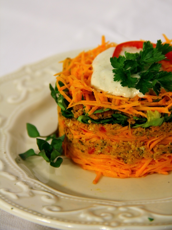 A diót és a napraforgó magot lecsöpögtetjük, a zöldségeket mossuk, hámozzuk, kisebb darabokra vágjuk. Mindent beteszünk a konyhai robotgépbe, és morzsásra, kicsit pépesre aprítjuk. Ízesítsük tetszés szerint, én szokásosan magyaros fűszereket használtam, só, bors, egy kis paprika…